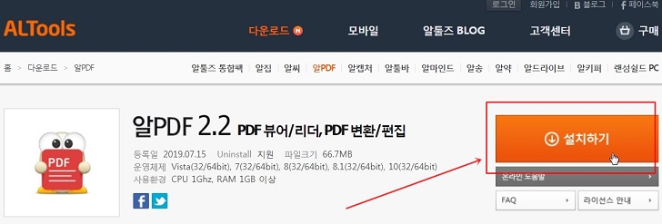 개발사 다운로드를 클릭하면 ALTools 홈페이지로 접속되어 알pdf 2.2를 다운 받으실 수 있습니다. 위 사진과 같은 화면에서 설치하기를 클릭 합니다.