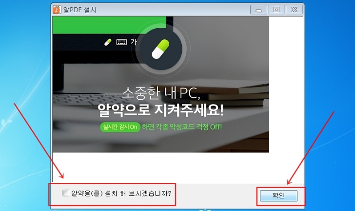 다음으로 알약을(를) 설치 해 보시겠습니까? 란 곳에 체크를 해제 또는 선택 한 이후 확인 버튼을 클릭 합니다.