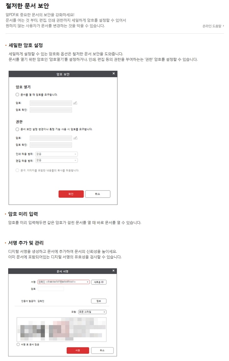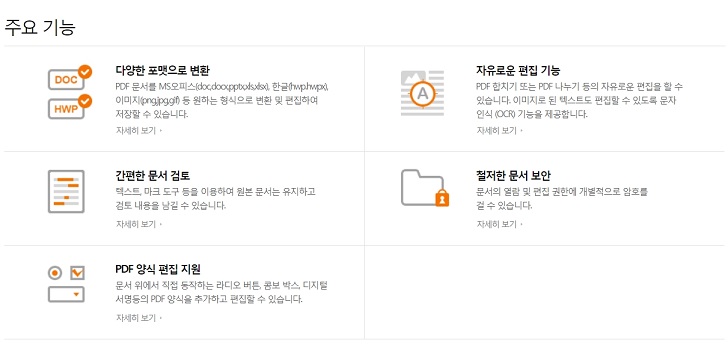 알pdf의 주요 기능은 총 5가지로 소개 하고 있습니다. 첫번째는 문서를 다양한 포맷으로 변환이 손쉽게 가능합니다. 두 번째론 자유롭게 편집이 가능합니다. 기존에 pdf를 편집하기 어려웠는데 알pdf 덕분에 가능해졌습니다. 이전에도 불가능했던거는 아니지만 조금 더 손 쉬워졌다는 표현이 맞는 것 같습니다. 다음으론 문서를 검토할 수 있습니다. 이 기능은 저도 사용을 안해봐서 잘 모르겠지만, 아래에 알툴즈에서 소개하는 페이지를 같이 첨부하였으니 참고 해주시기 바랍니다. 네 번째론 문서 보안이 가능합니다. 그리고 마지막으론 pdf양식을 편집 할 수 있습니다. 지금까지 알pdf의 주요 5가지 기능을 간략하게 보았습니다. 아래에는 알툴즈에서 제공하는 각 기능에 대한 상세 설명 페이지를 첨부하였으니 참고 해주시기 바랍니다.