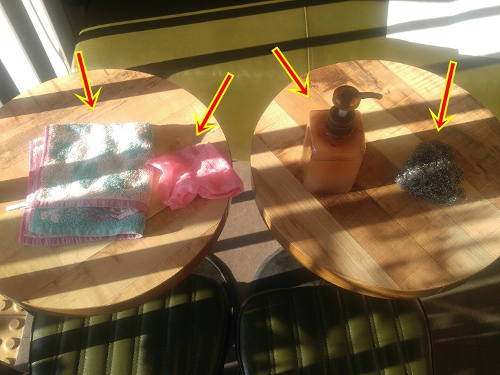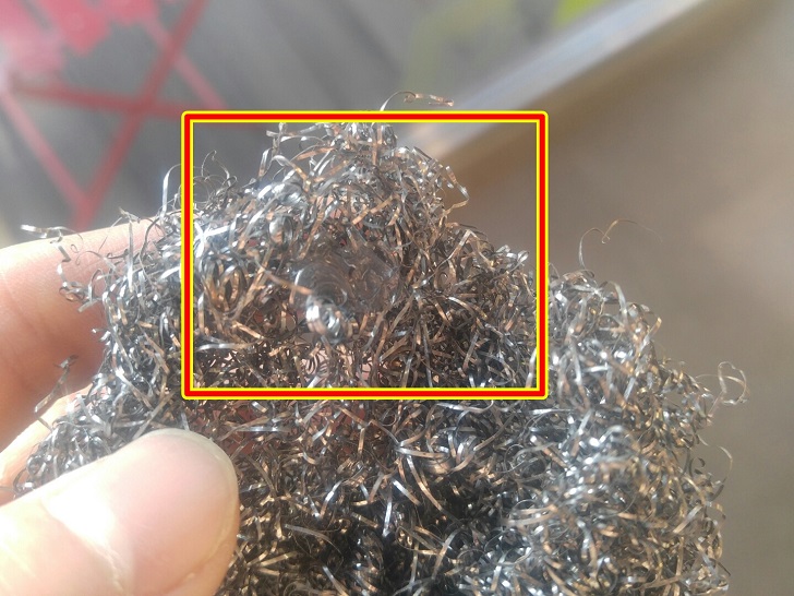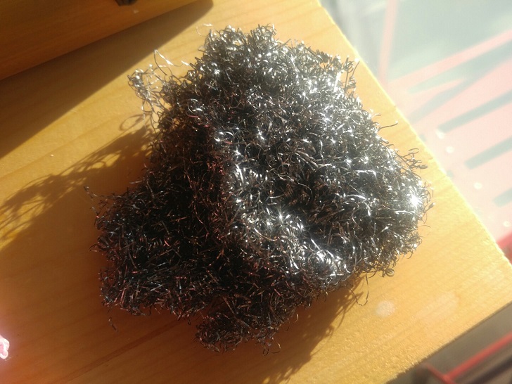 먼저 철 수세미에 세제를 뭍혀 주세요. 약간 물에 적신 후에 세제를 뭍히는게 효과적 입니다.