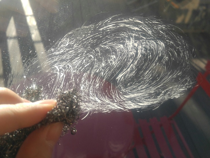 다음 단계는 일반 부드러운 수세미로 문질러 주시기 바랍니다. 그냥 마른 수건으로 해도 관계는 없지만 철 수세미로 제거 하면서 바른 세제가 말라버리면서 마른 수건으로 닦으면 세제 자국이 남아버립니다. 그래서 물기가 있는 부드러운 수세미로 한번 문질러 주면 테이프 자국 뿐만 아니라 유리창 청소까지 손쉽게 하실 수 있습니다.
