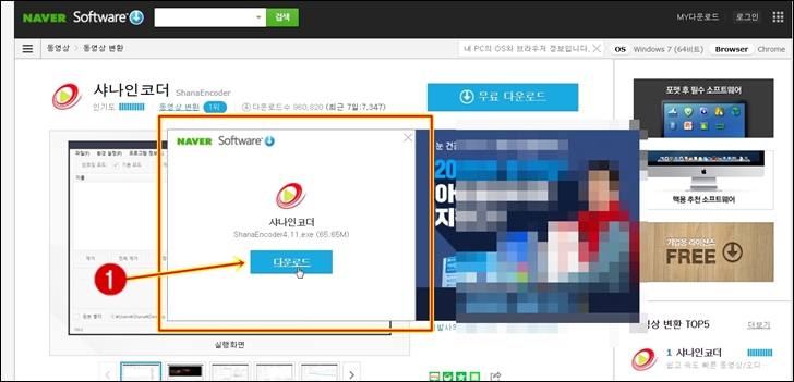 네이버 소프트웨어 페이지에서 샤나인코더 무료다운로드를 클릭 합니다. 추가적으로 동영상 변환 TOP5의 1위 프로그램이 샤나인코더 인것을 확인 하실 수 있습니다. 다음부터는 클릭만 해주시면 됩니다.