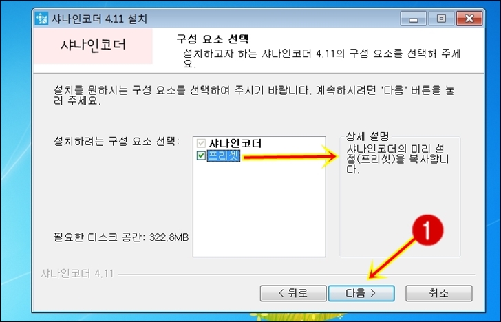 프리셋체크가 되어있는 것을 확인 하셨으면 다음을 클릭 하여 샤나인코더 설치하기위한 다음단계로 이동합니다.