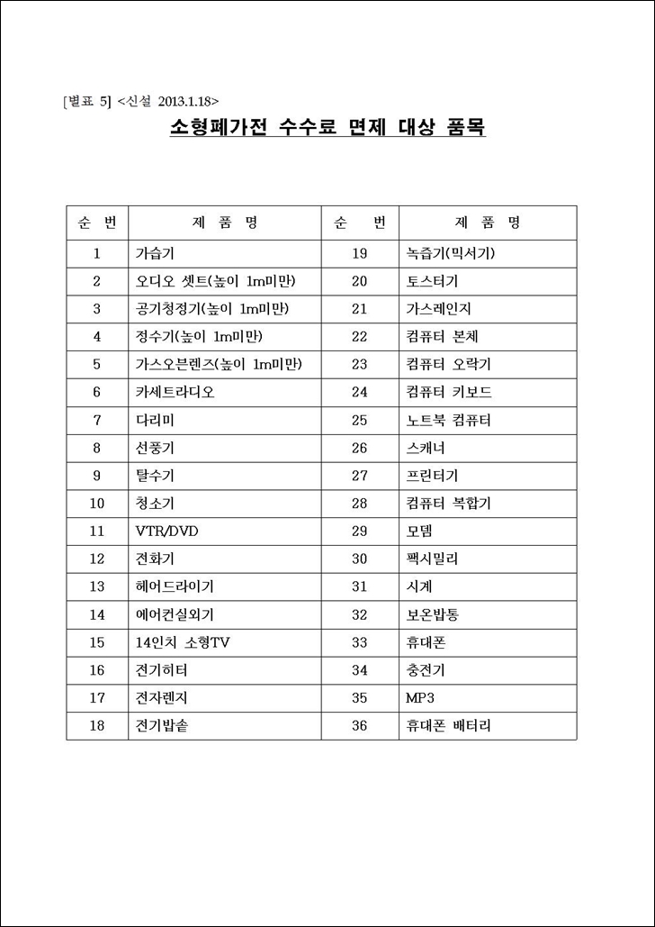 소형폐가전 수수료 면제 대상 품목.