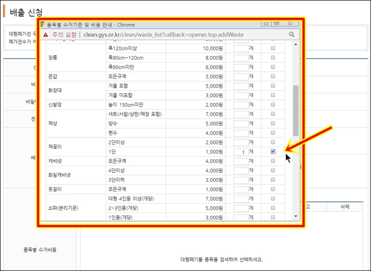 원하는 폐기물의 개수와 오른쪽에 있는 네모 체크박스를 선택하여 줍니다.