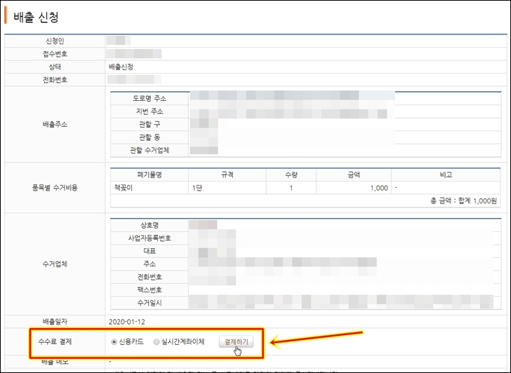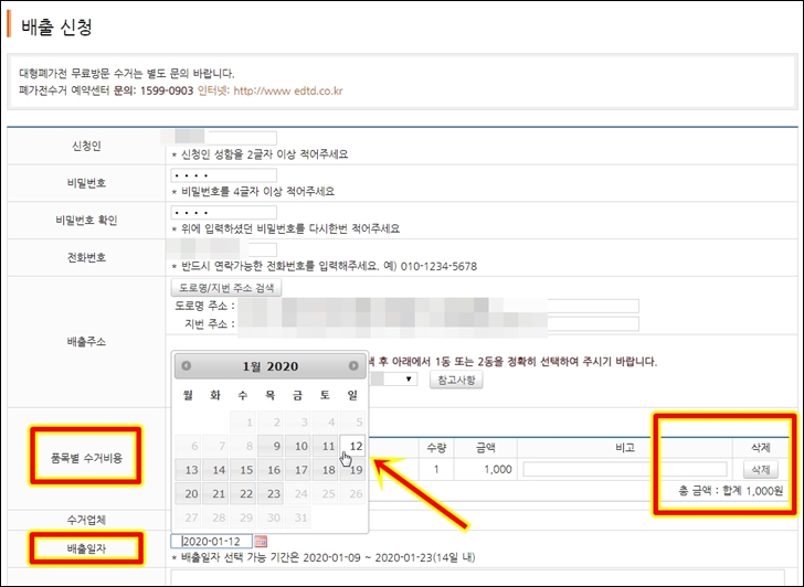 품목별 수거비용과 총금액을 확인하신 이후 배출일자를 클릭하여 날짜를 지정합니다. 배출일자를 2020년 1월12일 토요일로 지정하였습니다. 이 경우 하루 전인 2020년 1월 11일에는 수거장소에 스티커를 부착한 대형폐기물을 옮겨 놓아두셔야 합니다. 배출일자 이후에 수거하면 문제가 없겠지만 배출일자에 맞춰서 수거하게 되는 경우 수거가 되지 않을 수 있기 때문입니다. 꼭 유념하셔서 배출일자 하루전까지 대형폐기물을 배출 해두시기 바랍니다.