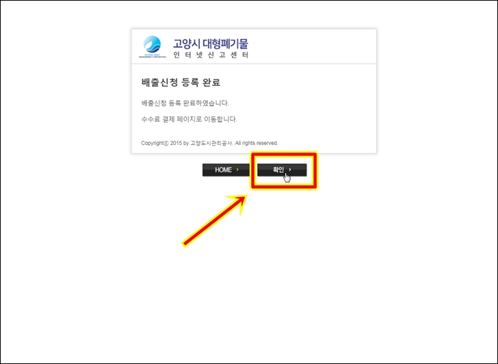 배출신청 등록이 이제 완료 되었습니다. 다음 결제 페이지로 이동을 위해 확인을 클릭 합니다.