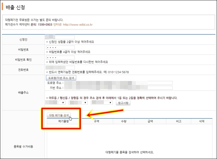 이후 나오는 페이지에서 신청인, 비밀번호, 비밀번호 확인, 전화번호, 배출주소를 차례대로 입력하여 줍니다.