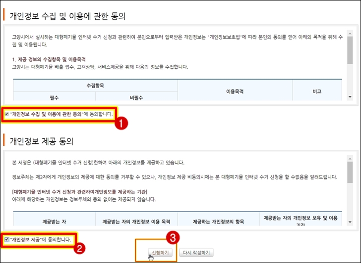 다음으로 개인정보 수집 및 제공에 동의를 하시고 신청하기를 클릭 합니다.