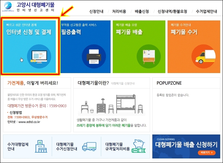고양시에서 운영하는 대형폐기물 인터넷신고센터 첫 화면 입니다. 해당 화면에서 왼쪽 상단에 있는 인터넷 신청 및 결제 부분을 클릭 합니다. 참고로 비로그인 하여도 이용이 가능합니다.