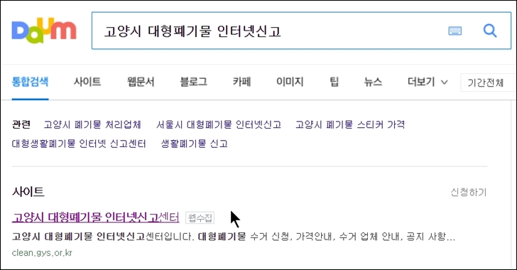저는 고양시 대형폐기물 인터넷신고센터를 이용하여 온라인에서 스티커를 발급 받아보도록 하겠습니다. 먼저 포털에서 검색한 이후 해당 사이트로 들어갑니다.