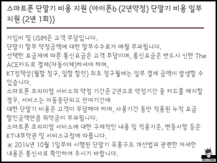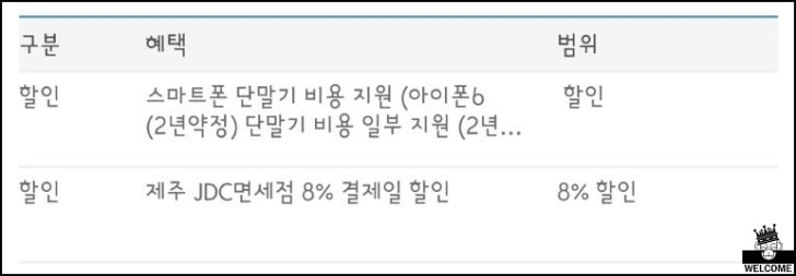 스마트폰 단말기 비용 지원이 아이폰6인거 보면 정말 오래된 상품이란게 보이네요. 할인정보에서 쓸만한거는 제주 JDC면세점에서 8% 할인 정도 인거 같습니다.