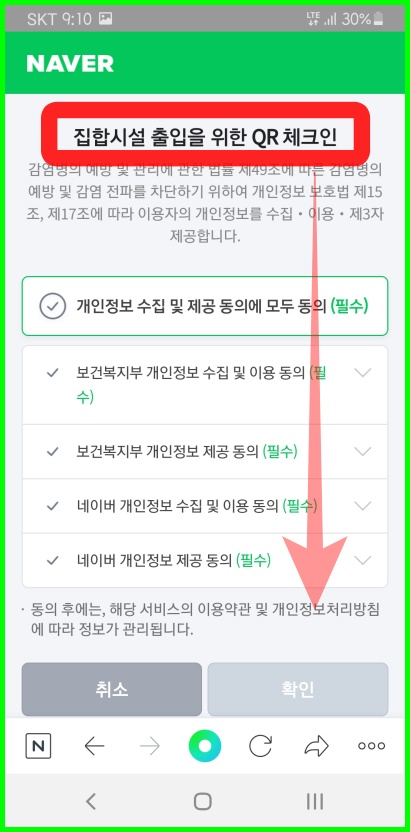 그리고 왼쪽 사진이 네이버 앱 첫 메인페이지 입니다. 위 페이지에서 우측 상단에 QR체크인 버튼을 터치 합니다. 그리고 오른쪽 사진 화면이 보이면 개인정보 이용에 동의를 해줍니다.