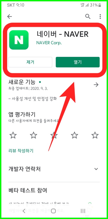 일단 네이버 앱을 다운로드 합니다. 저는 안드로이드 폰을 사용해서 play store에서 다운로드 하였지만 아이폰을 사용하시는 분들은 앱스토어에서 검색 이후 다운로드 하시면 됩니다. 미리 다운로드 한 부분이 있기에 저는 열기를 터치하여 네이버 앱을 활성화 시켜보겠습니다.
