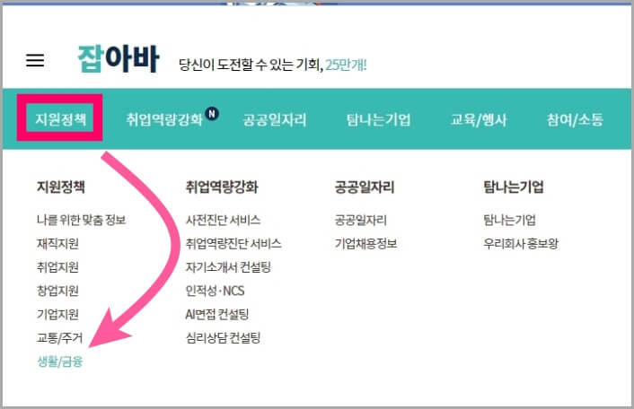 해당 포털사이트에서 좌측 상단에 지원정책 -> 생활/금융 목록을 클릭합니다.