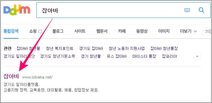 포털사이트에서 잡아바 또는 잡아바 홈페이지를 검색하면 위 화면처럼 결과가 나옵니다. 해당 홈페이지는 경기도 일자리 플랫폼으로 고용지원, 교육 및 대외활동과 채용, 창업정보를 제공하는 홈페이지입니다.