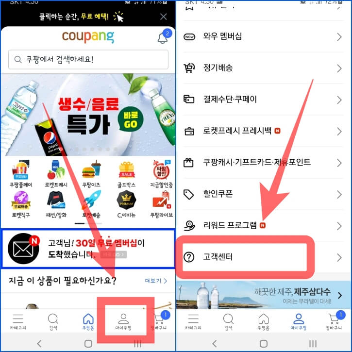 쿠팡 모바일 첫 화면에서 우측 하단에 "마이쿠팡"을 터치합니다. 이후 화면을 아래로 내려 "고객센터"를 터치 합니다.