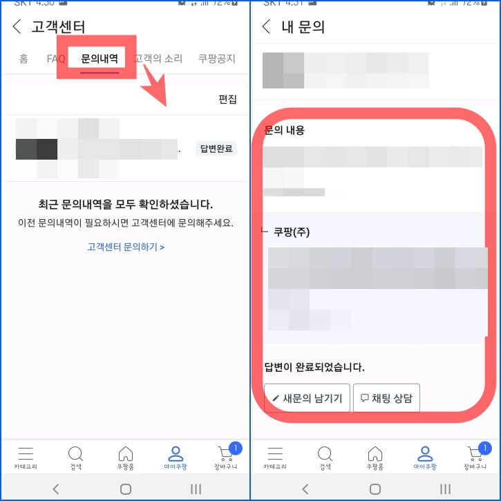 쿠팡 문의내역 삭제 및 확인방법 2가지.