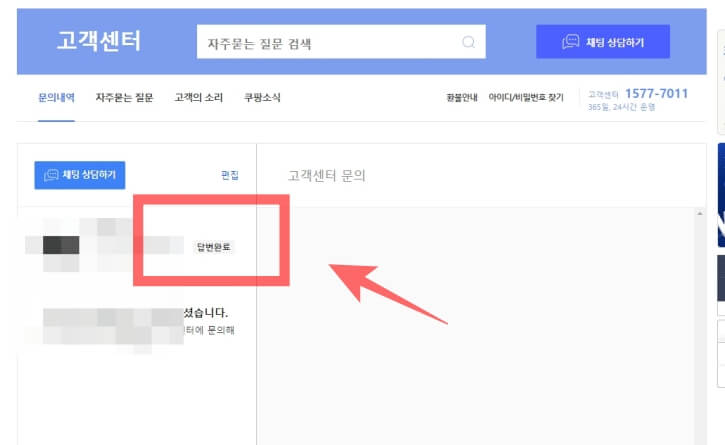 그럼 이부분에서 문의한 내역을 확인 하실 수 있습니다. 참 쉽죠잉? 근데 왜 저는 못찾았는지 참 그렇습니다. 이제 모바일로 확인 해보겠습니다. 사실 쿠팡은 모바일에서 더 많이 사용되는 플랫폼입니다. 참고로 쿠팡 고객센터는 1577-7011로 365일 24시간 운영한다고 합니다.